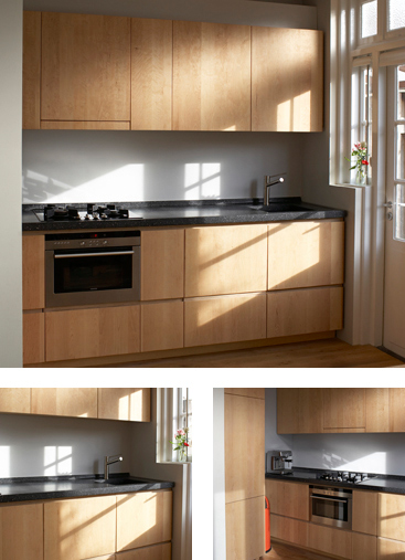 Berken keuken van massief 3-lagenplaat met een granito blad. De fronten en lades hebben "blinde" grepen.