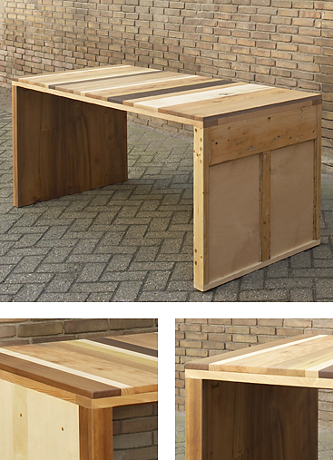 Een van de bureaus met een verrassend blad gemaakt van diverse houtsoorten overdwars verlijmd. Afgewerkt met olie en was.