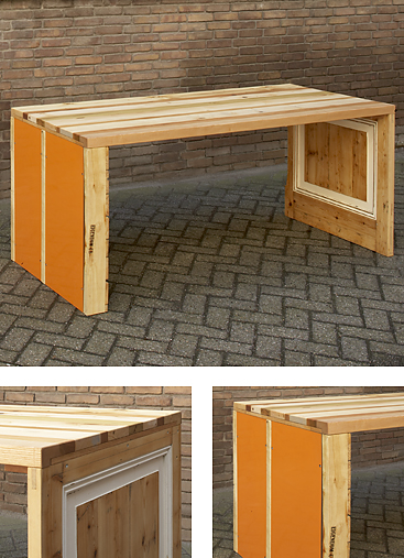 Ander bureau waarvan het blad bestaat uit diverse houtsoorten die in de lengte verlijmd zijn. Te zien zijn een oude deur en pallet.